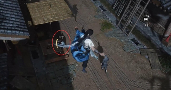 2、往右边枯树的位置走,来到图示位置后对话【许言】;