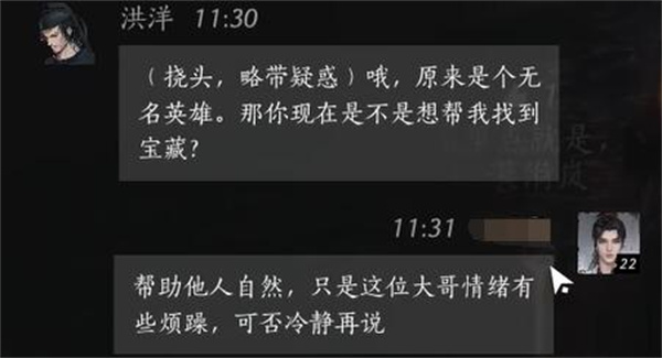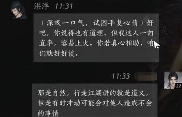玩家:那是自然,行走江湖讲的就是道义,但是有时冲动可能会对他人造成不会的事情。