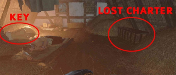 在楼上睡觉的士兵旁边有一个中等难度的箱子,失去的特许权就藏在里面。
