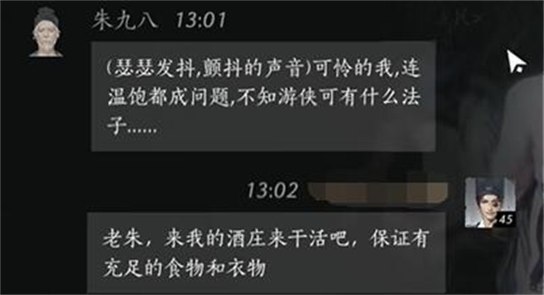 玩家:老朱,来我的酒庄来干活吧,保证有充足的食物和衣物。