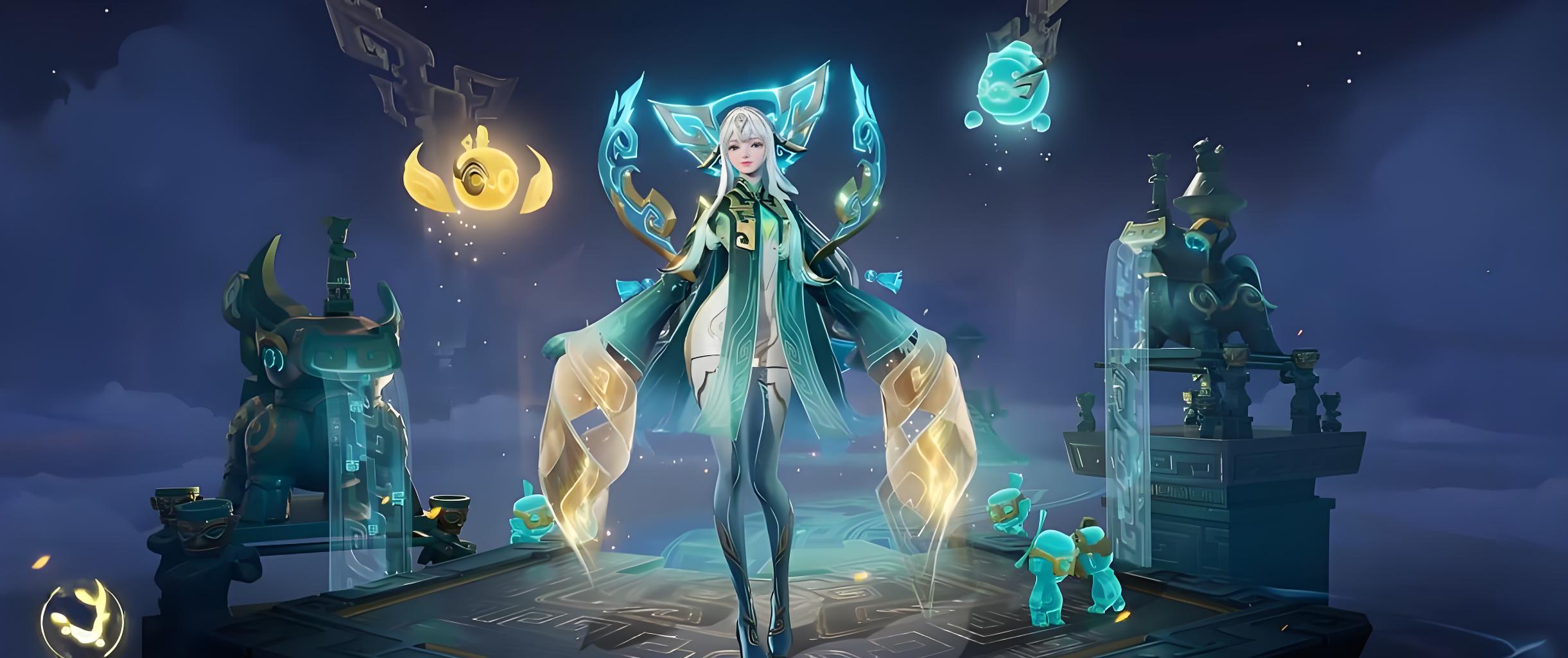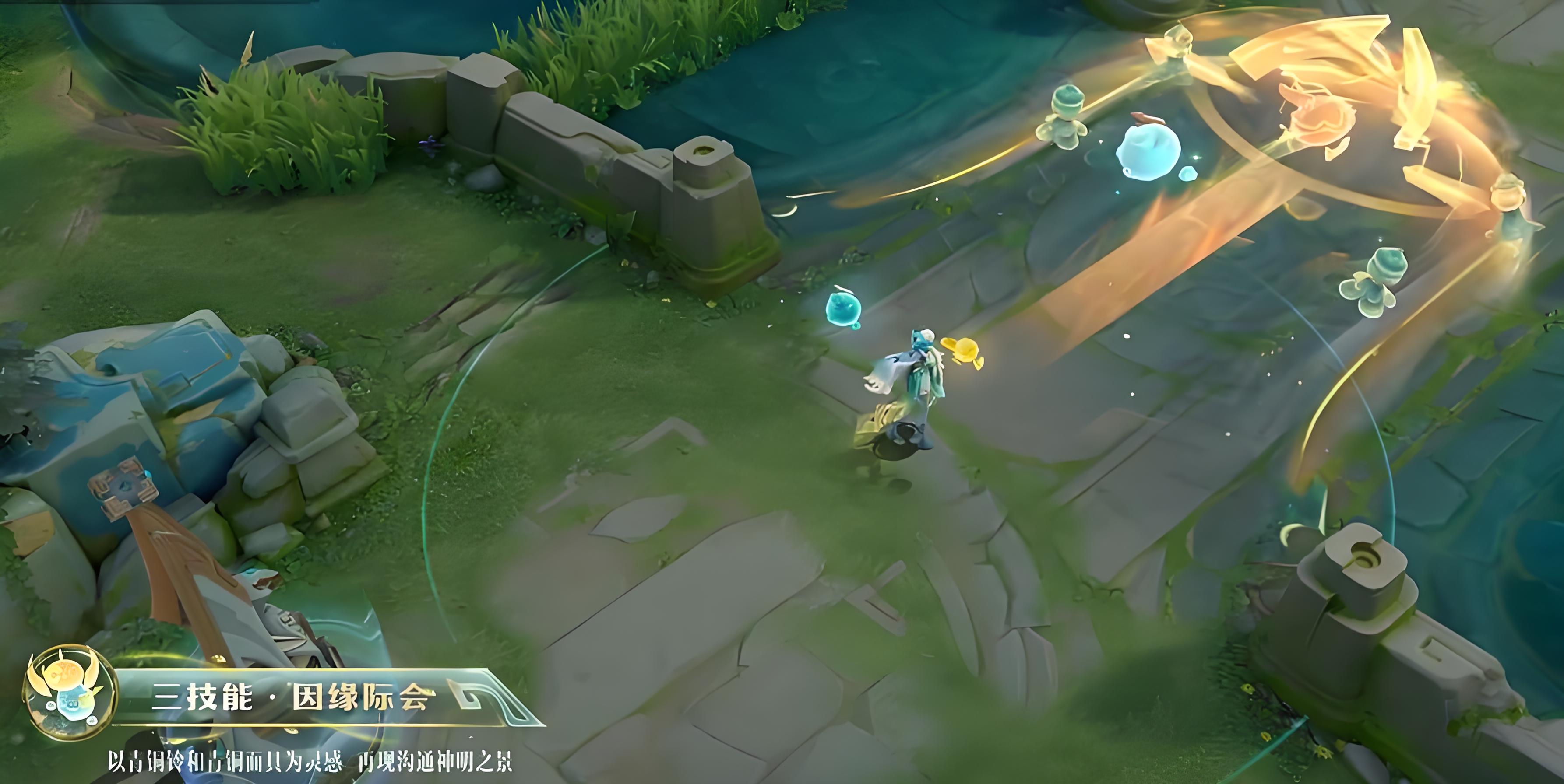 4、三技能以青铜铃和青铜面具为核心灵感,缘崽会沿着铃铛指引的光路跃出,技能释放瞬间还会显现巨大金色面具虚影覆盖大范围区域。