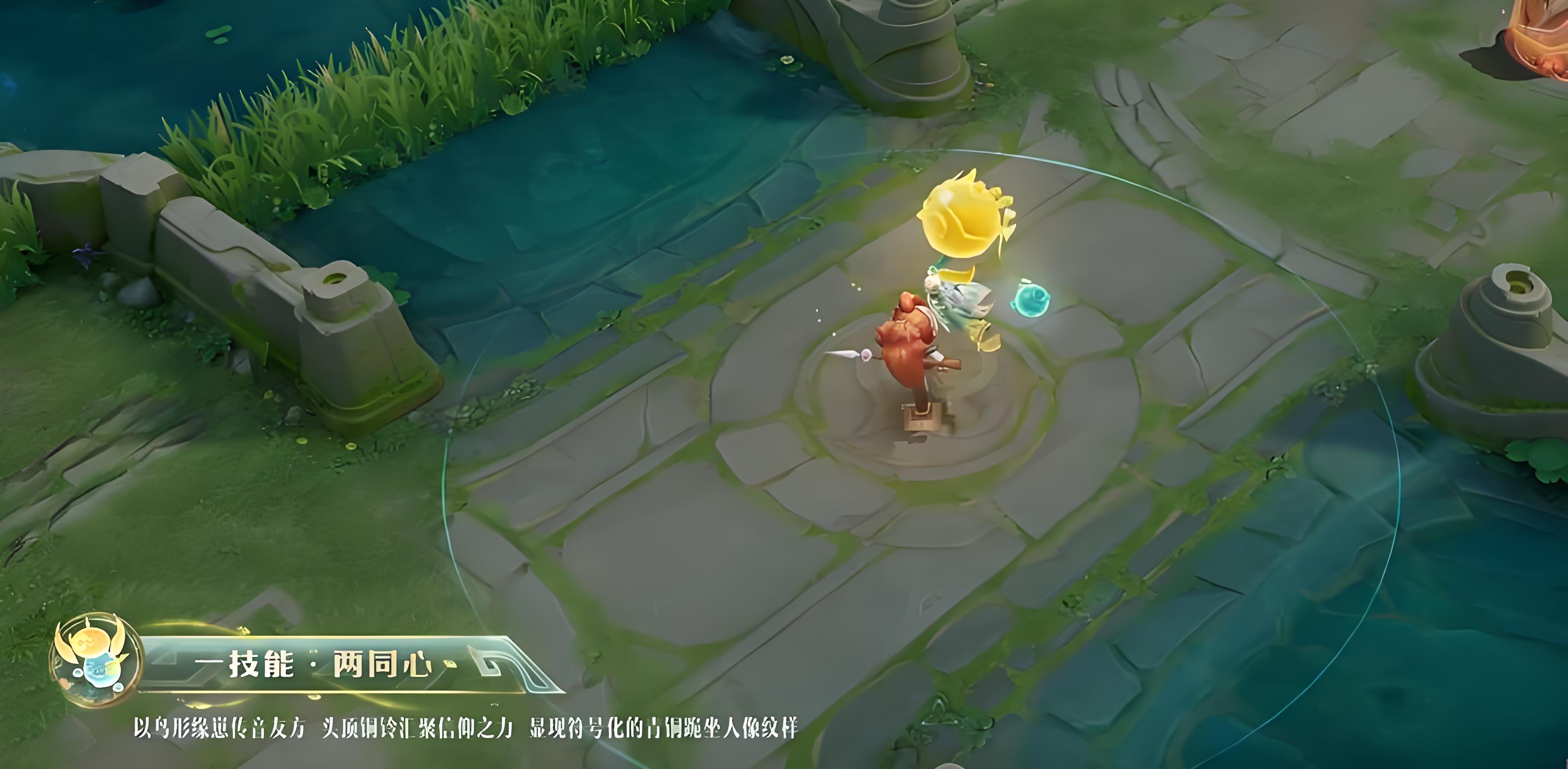 2、一技能释放时以鸟形缘崽向友方传递音波,信仰之力会汇聚在少司缘头顶铜铃,铜铃表面还会显现符号化青铜跪坐人像纹样。