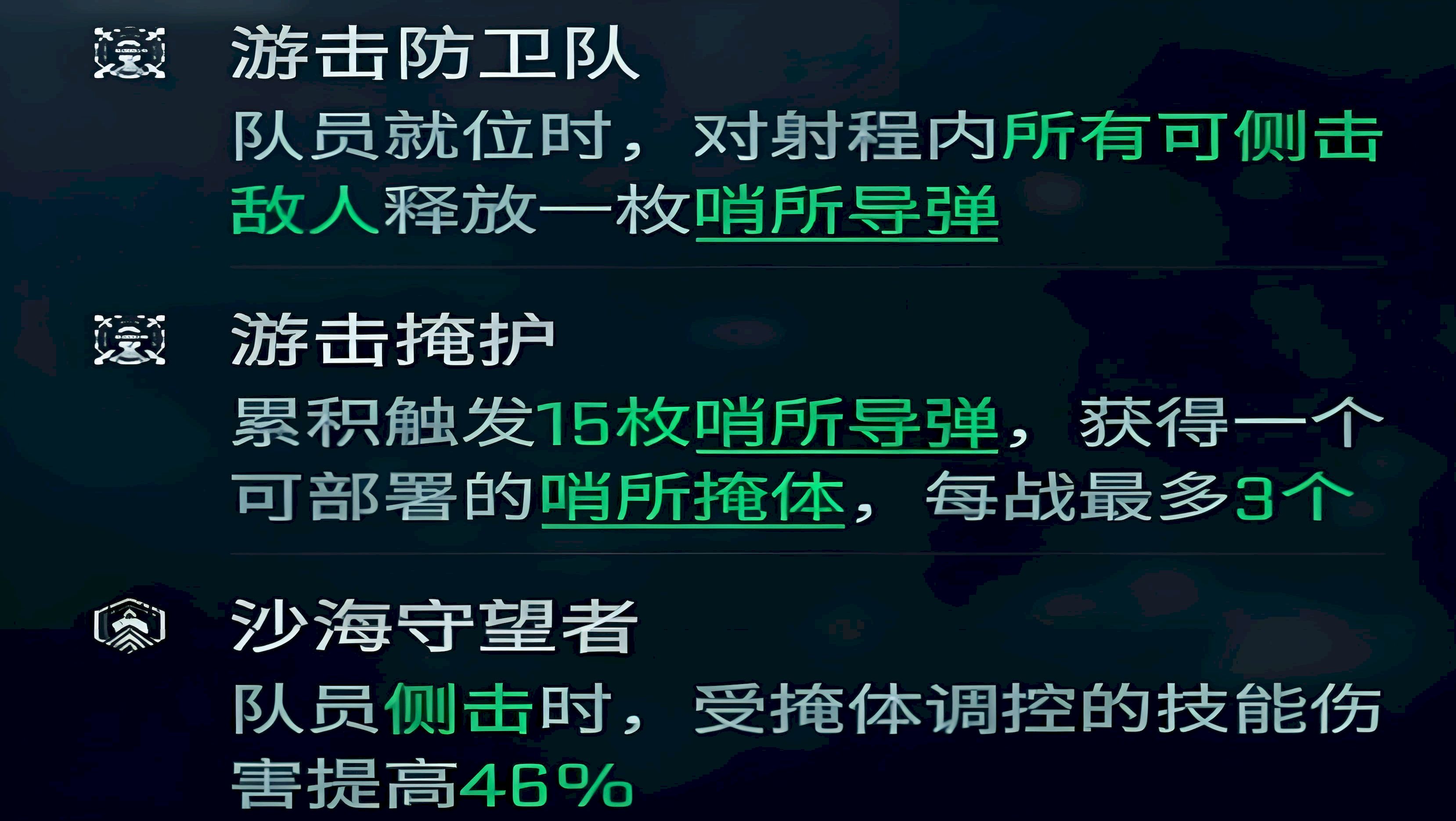 1、沙鹰本色是基础且常见的模组,主要强化角色侧翼攻击能力,遭遇敌人包围时可降低所受伤害,适合新人初期开荒,提升战场适应能力。