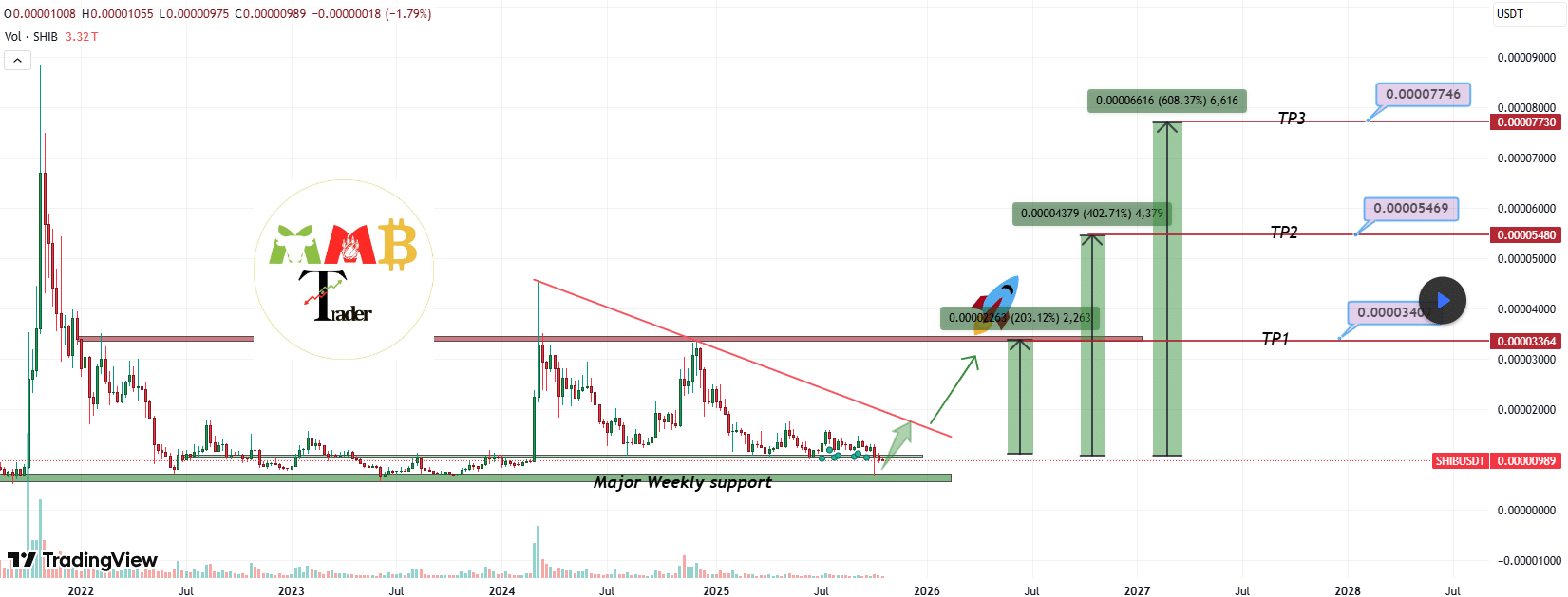 值得注意的是,MMBTrader长期坚持该目标位。在早前分析中,他预言SHIB将再次以周线100%涨幅烛形震惊市场,并称突破行情将触发这轮全面牛市。
