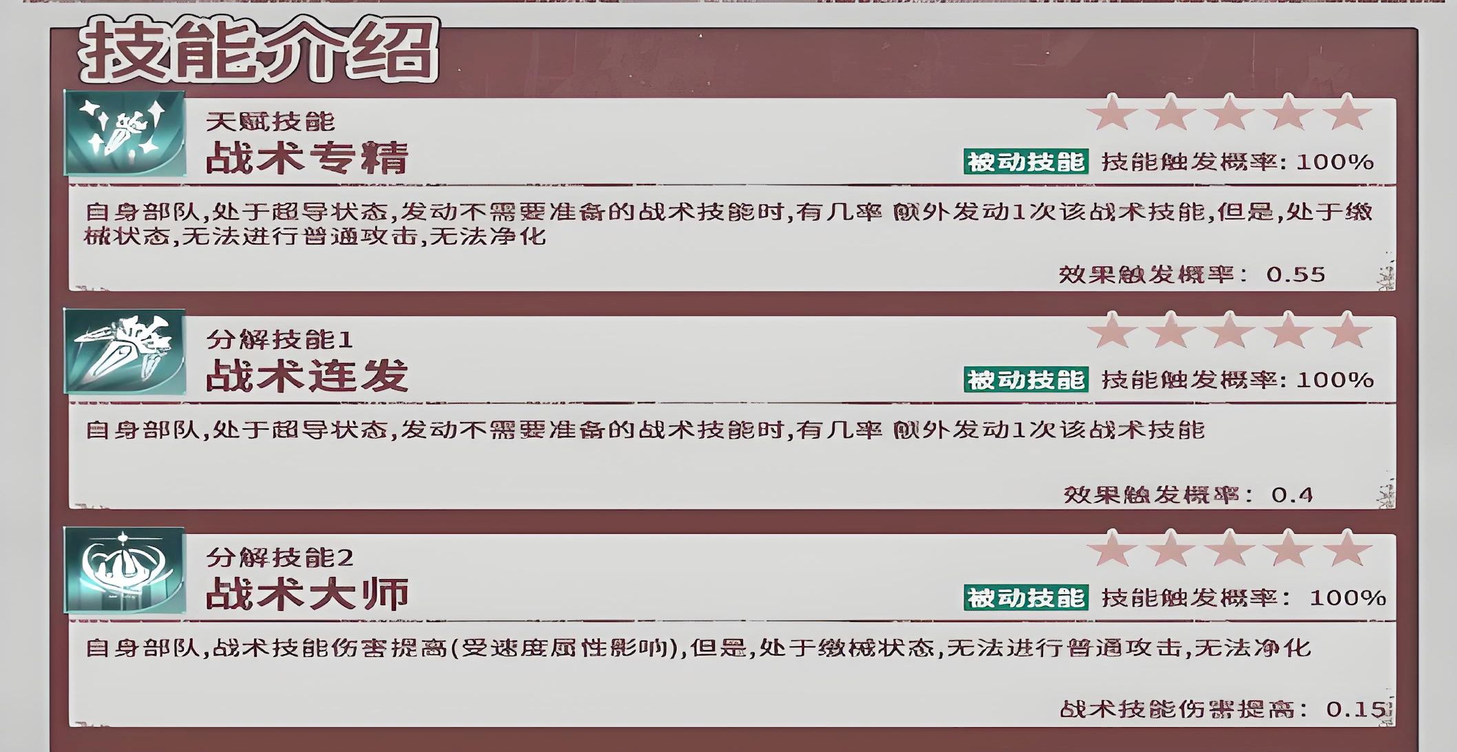 2、技能机制斐拉依赖超导状态天赋与分解技能联动,能额外发动战术技能并提升伤害,处于缴械状态会失去普攻能力且无法净化。