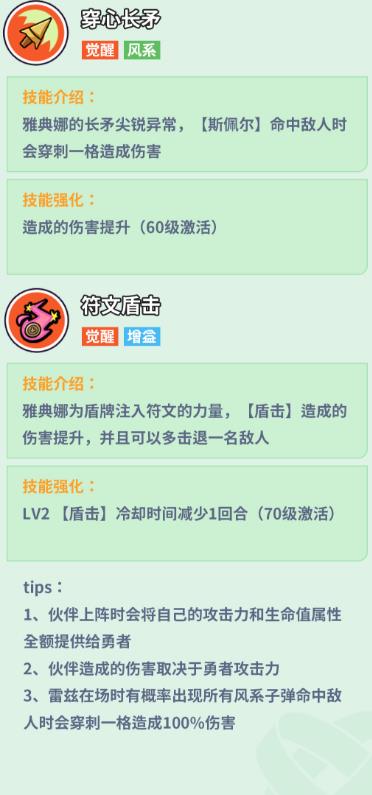 5、实战中伙伴上阵会全额共享自身攻击力和生命值给勇者,伤害取决于勇者攻击力雷兹在场时风系子弹有概率穿刺一格造成全额伤害。