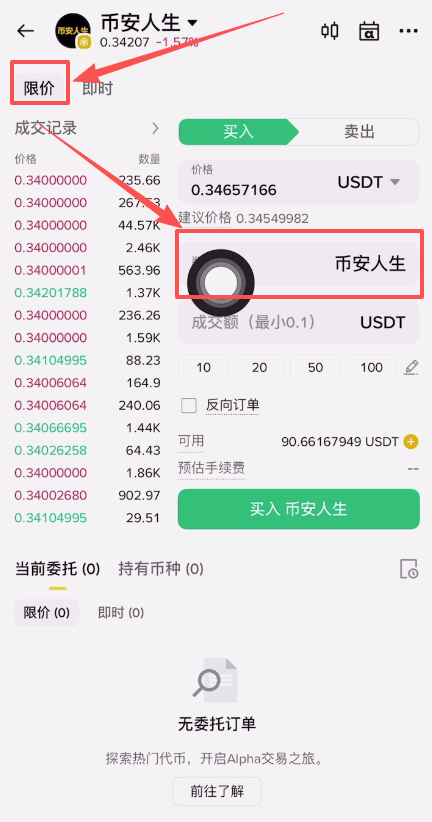 “即时”就是我们直接输入金额就可以购买成功。比如说我现在就想购买,我就使用这个“即时”,然后输入金额,他会告诉我10USDT可以购买到26.7颗币安人生代币。嗲几下方的【下单】。再次点击二次确认,就购买成功了。