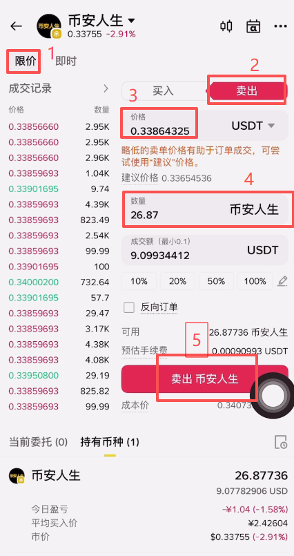 如果你想把它卖掉,我们也可以用同样的方式进行卖出。这时候同样我们可以在这个地方立刻卖出,你可以在这里设置“限价”来进行卖出。选择【卖出】,就可以设置价格来进行卖出了。比如我就设置这个价格,然后输入想卖出的全部数量,点击卖出币安人生币。