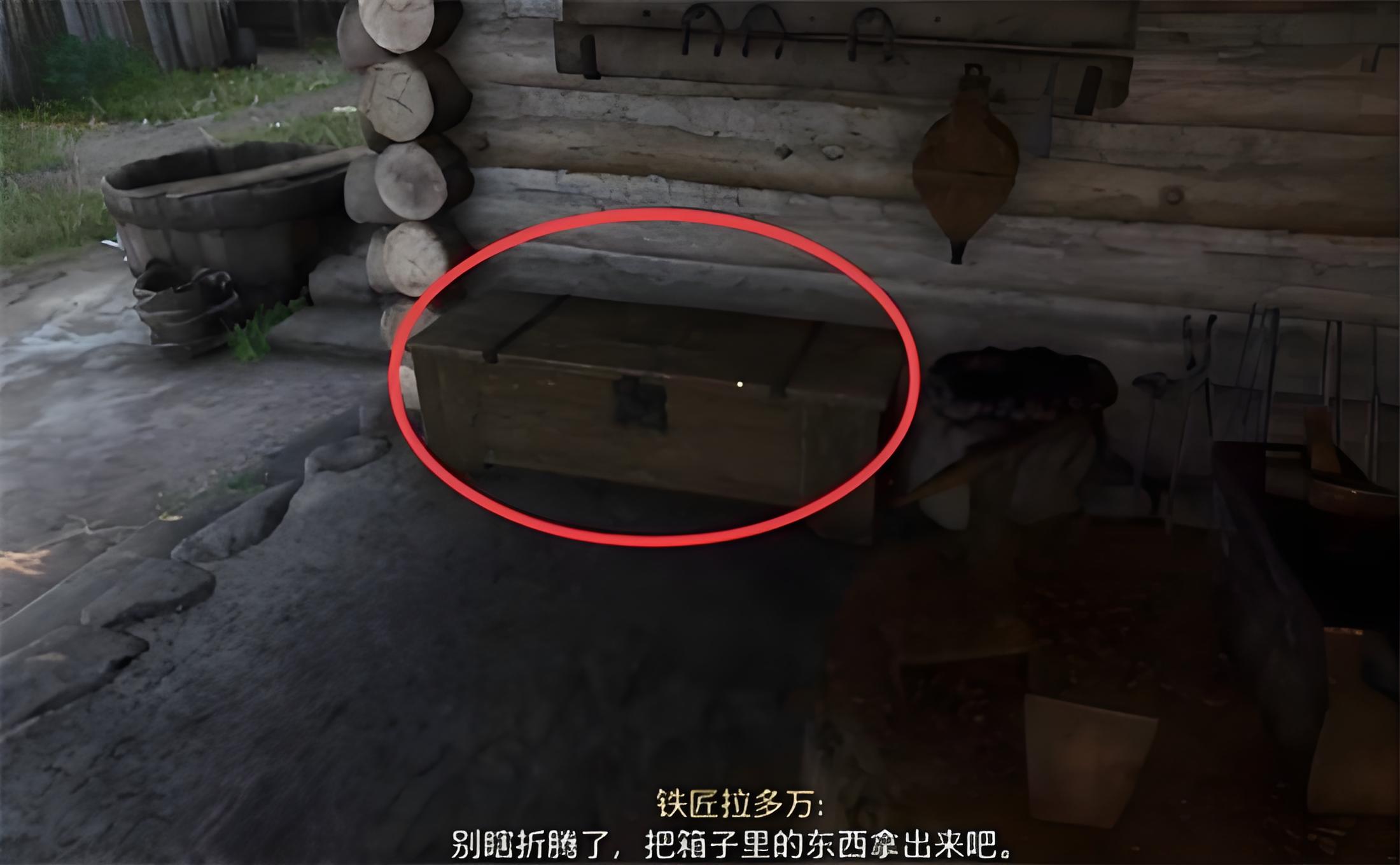 2、根据指引打开拉多万的箱子,拾取完成锻造所需的关键材料,确保材料齐全后前往附近锻造台准备进入操作环节。