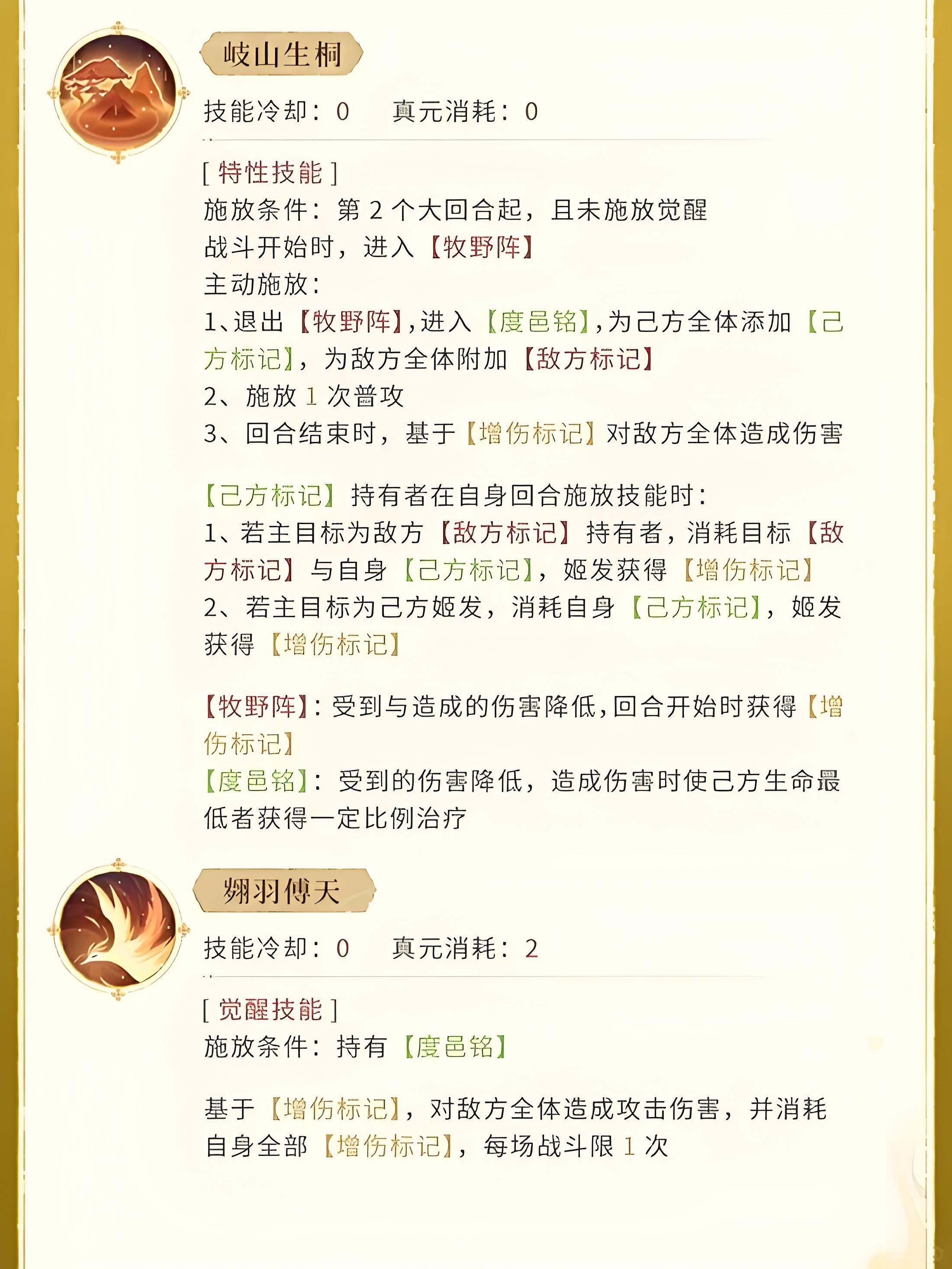 2、满足施放条件后退出牧野阵进入度邑铭状态,为己方全体加己方标记敌方全体加敌方标记,立即普攻且回合结束按增伤标记。