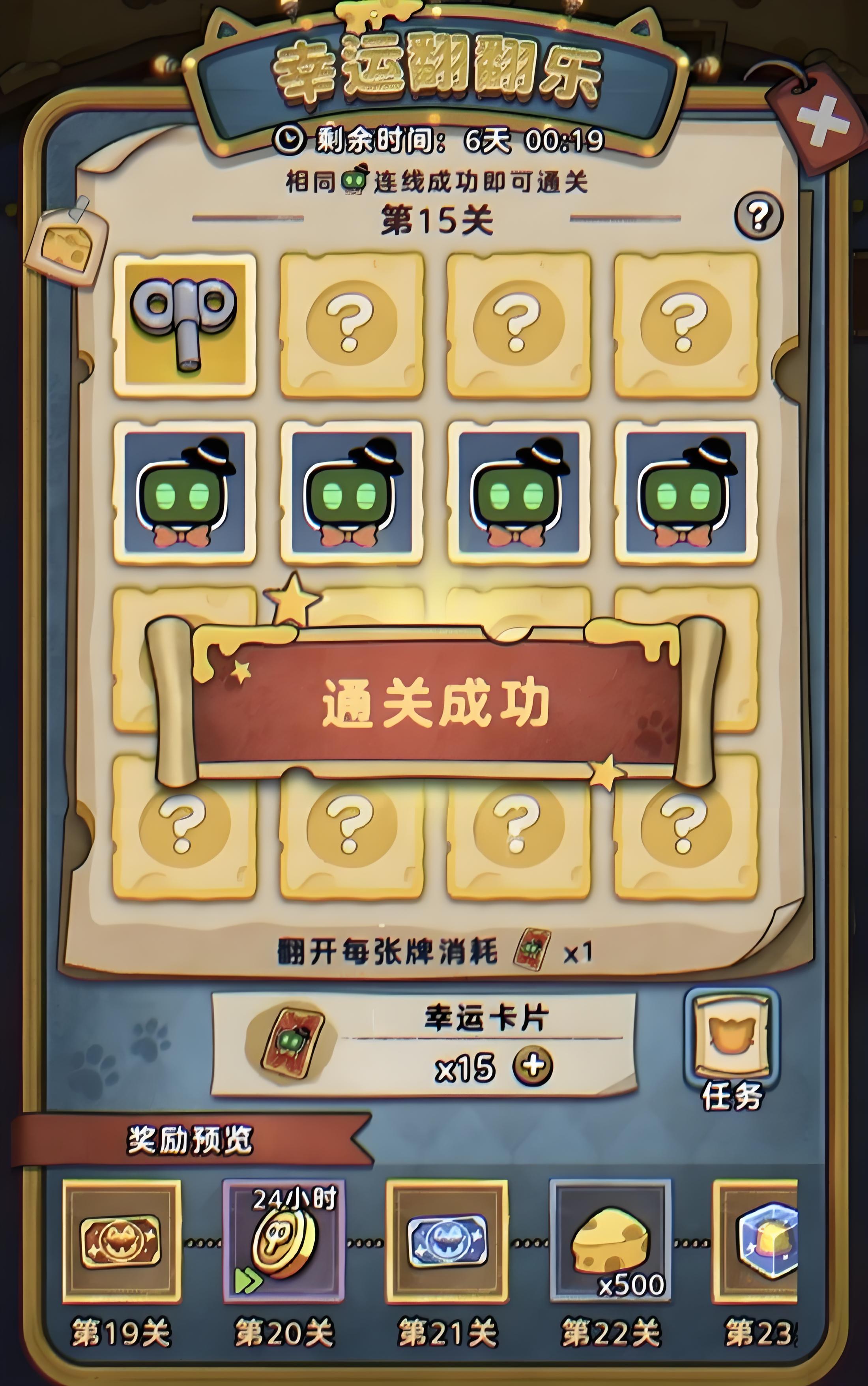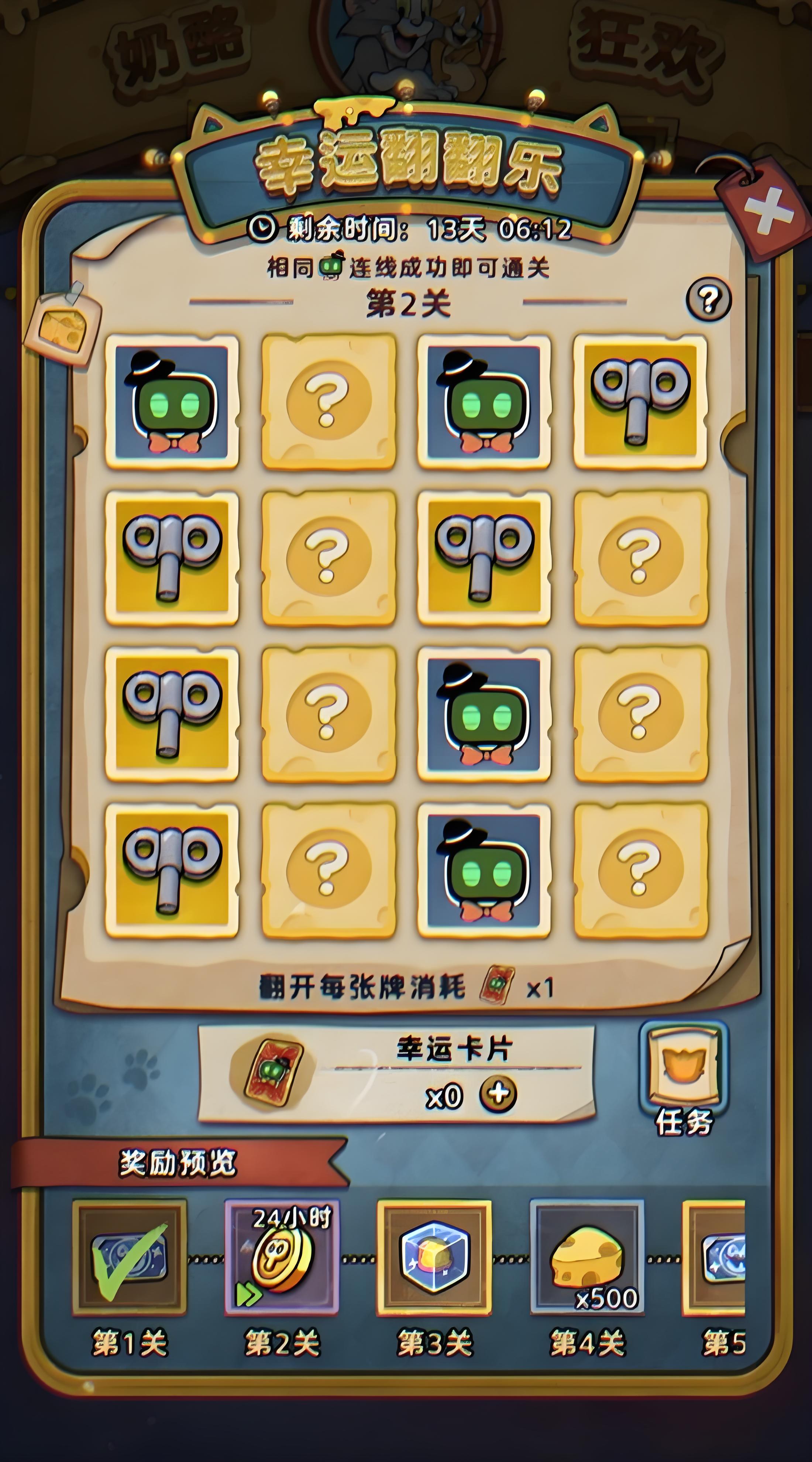 2、每次翻牌需消耗一张幸运卡片,该资源所有关卡通用未用完部分可累积至后续关卡,无需担心单次活动内浪费。