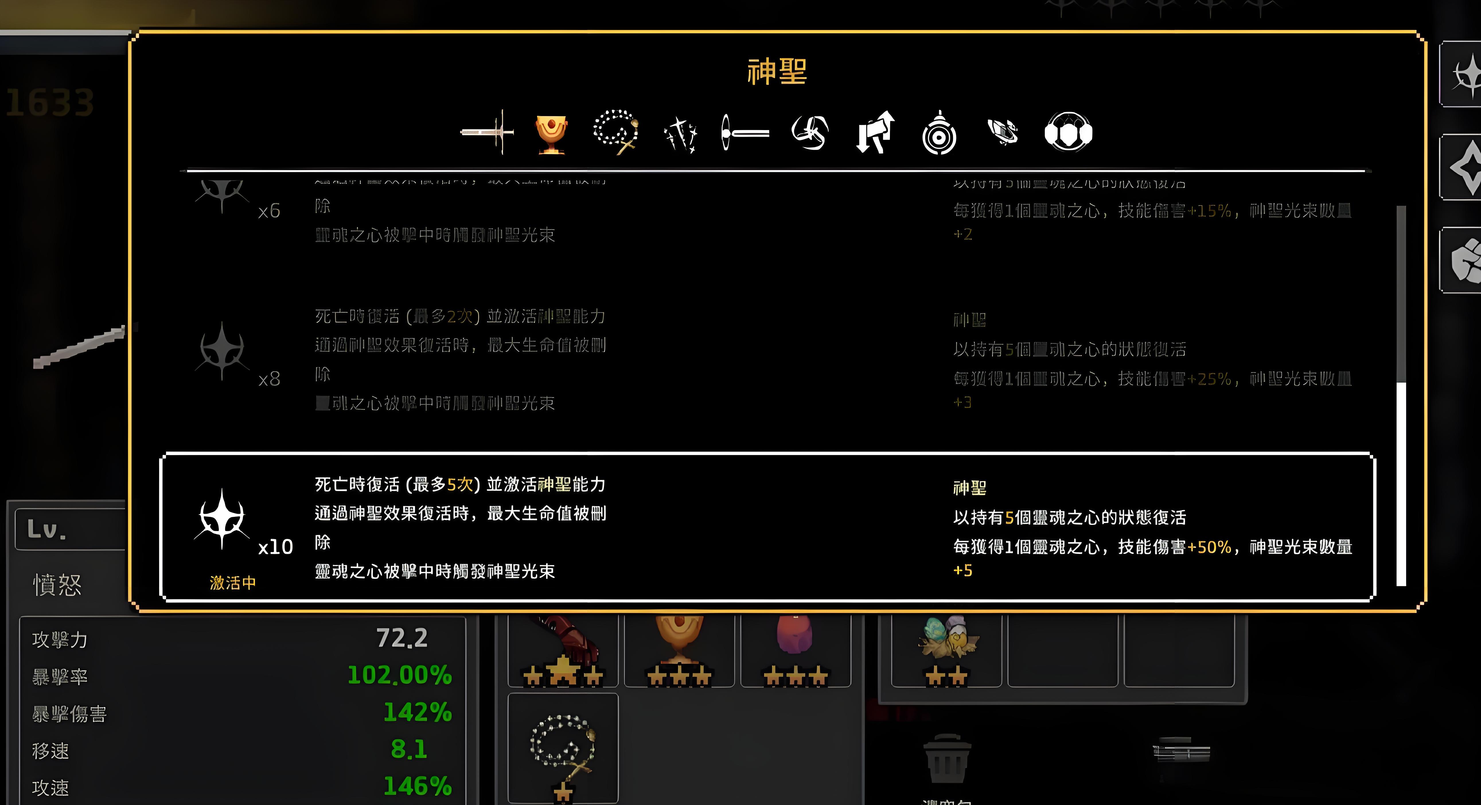 3、技能加点优先混沌与秩序天赋,免除龙餐消耗实现无缝龙化循环,复活技能投资神圣属性拉满五次复活提升续航。