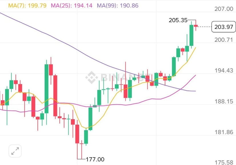 此类关键位收复往往成为趋势反转的验证点。只要价格稳定在194美元上方,继续上攻210至220美元区域的概率极高。