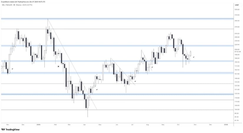 Solana从185-190美元支撑区反弹,清晰展现出看涨反转结构的形成。来源:Rand via X