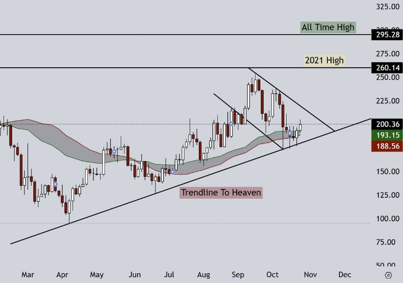 Exy的技术框架指出,Solana正沿上升趋势线形成教科书级别的看涨延续形态,该形态被戏称为"天堂趋势线"。价格当前在193-200美元区间震荡,恰好位于自初夏以来持续提供可靠支撑的趋势线上方。