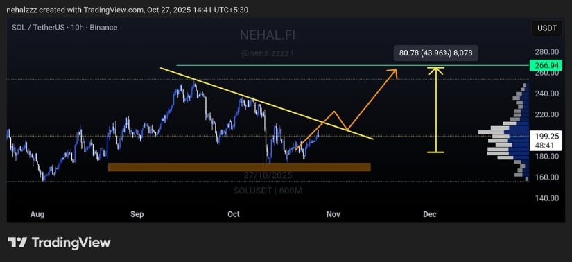 Solana突破长期趋势线暗示可能迎来44%涨幅冲击266美元,190-200美元区域的强势吸筹提供支撑。来源:Nehal via X