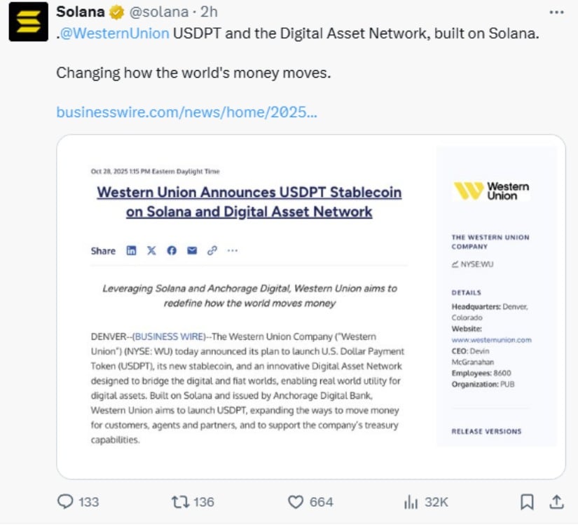 拥有174年历史的汇款巨头西联汇款(Western Union)周二宣布,将在Solana区块链上推出其美元稳定币USD Payment Token(USDPT)。