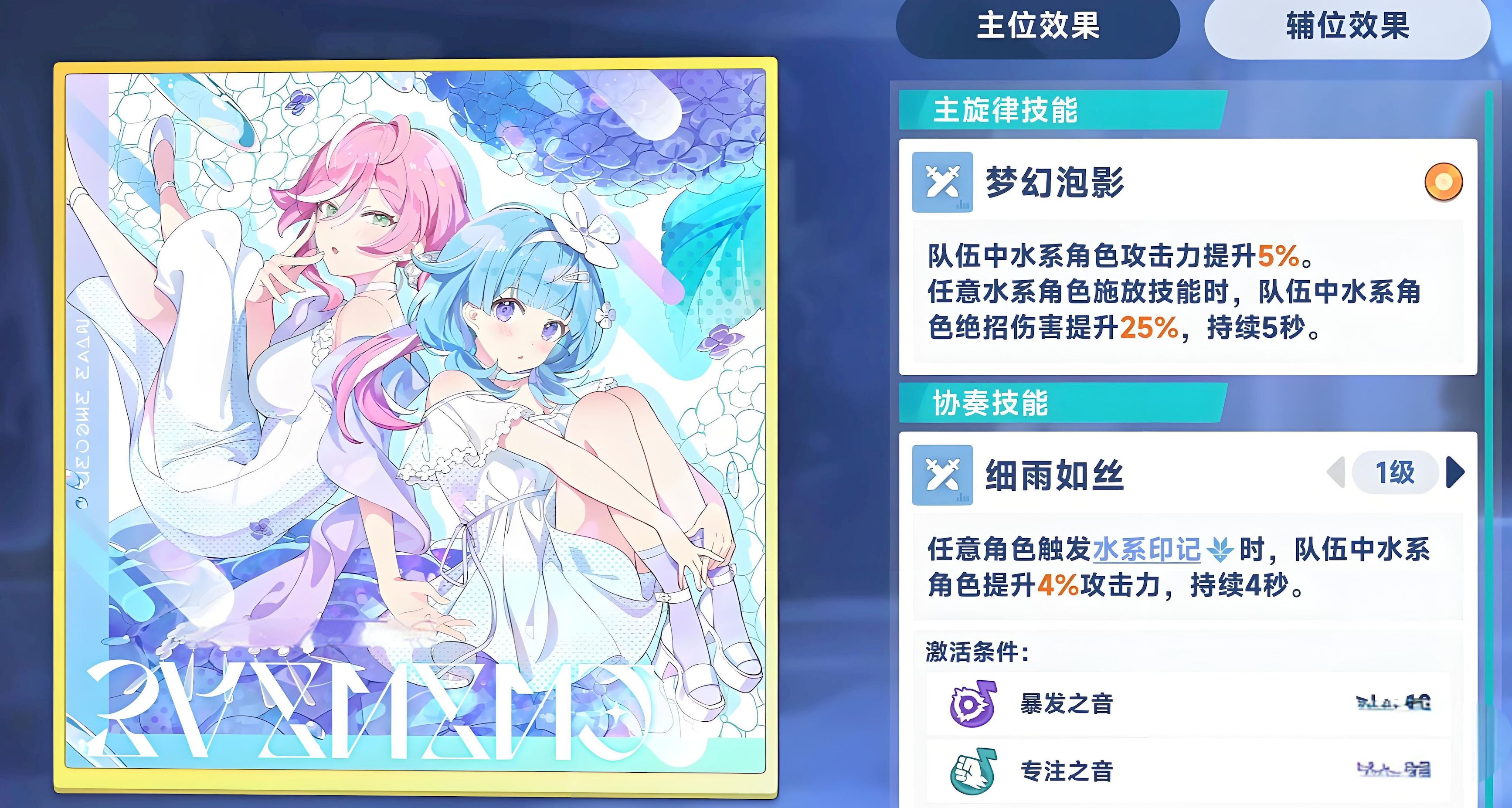 2、水绝招标签的秘纹专门提升水属性角色大招输出,先了解标签属性再查看基础数值加成,最后重点关注右侧主位和辅位效果。