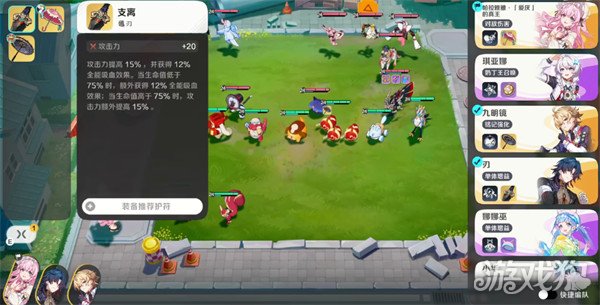 目前他在游戏当中技能效果上面,根据技能可以提升自身的攻击力,在攻击数值上面有15%的提升之后,还可以给自己带来一定的全能吸血效果,这个血液数值其实跟很多元理属性带来的羁绊效果一样,因为也有12%的全能吸血提升效果,那么在生命值它有75%的情况下,可以增强这里的吸血百分比,所以如果前期他第一个被敌方攻击,只要他的血量低于75%,使用这个技能还是有一定优势的,而且在增加了吸血能力之后,这个角色他自身生存能力相对来说也是更好用一些。