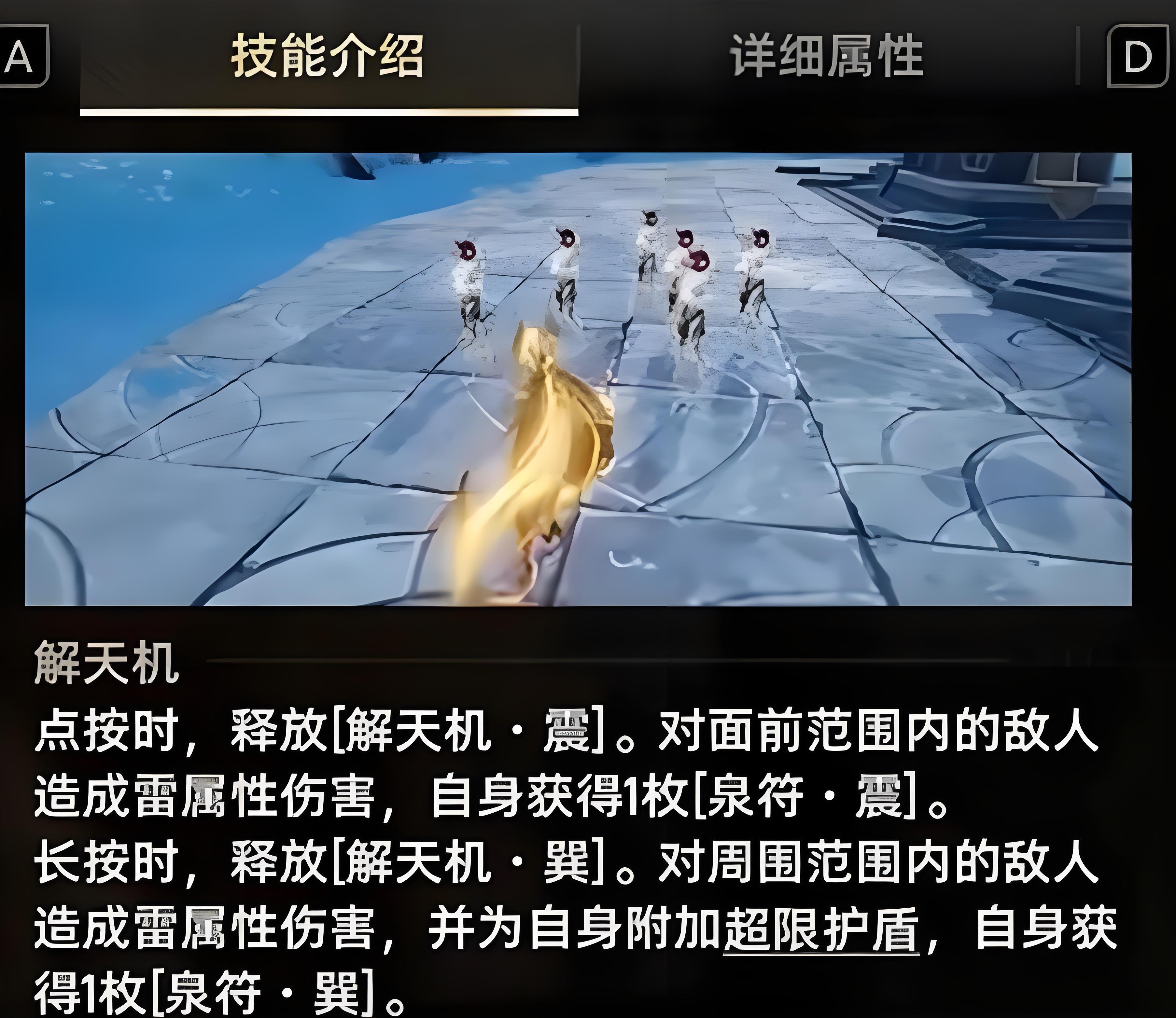 2、解天机点按获全符阵,造成150%雷属性伤害适合单体打击,长按生成全符训给全队24秒增益,双符训触发天地鸣提全队30%技能伤。