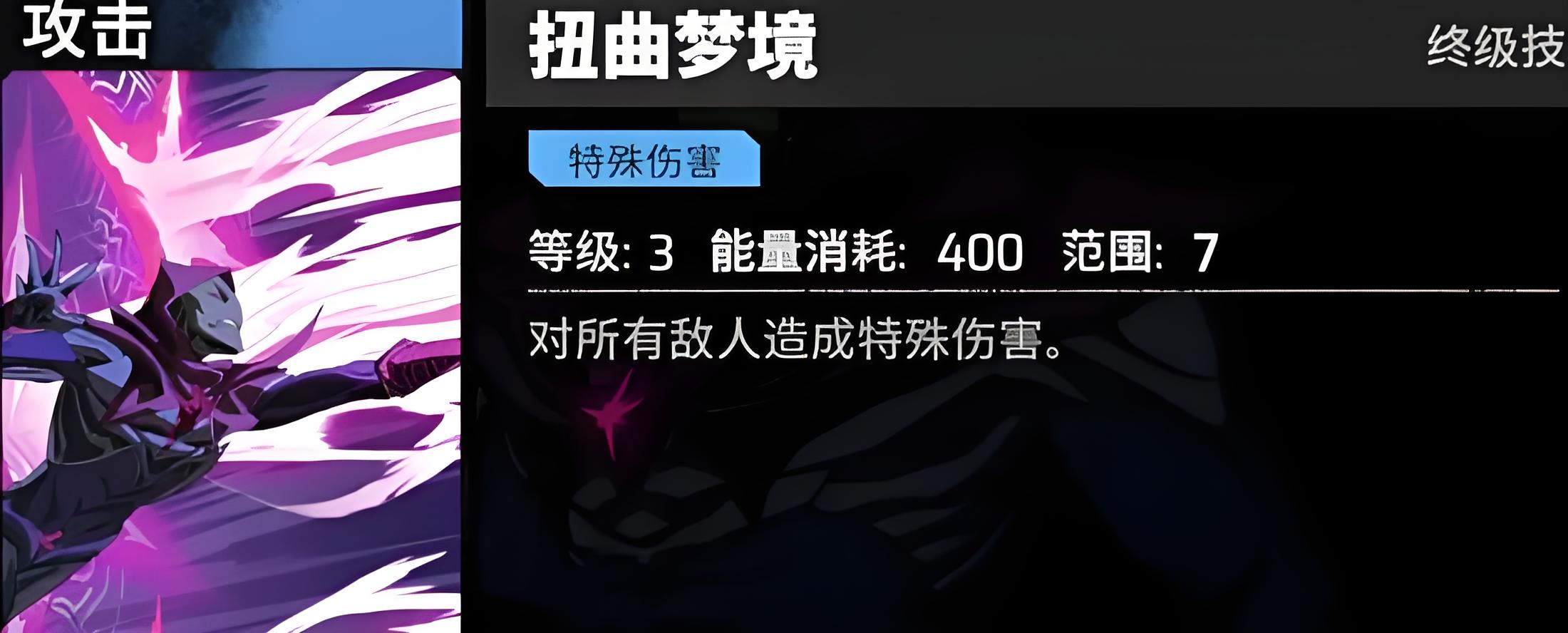 2、扭曲梦境作为攻击性技能造成范围伤害并附带控制,能量消耗少范围广,等级提升后延长敌人混乱或减速时间创造输出机会。