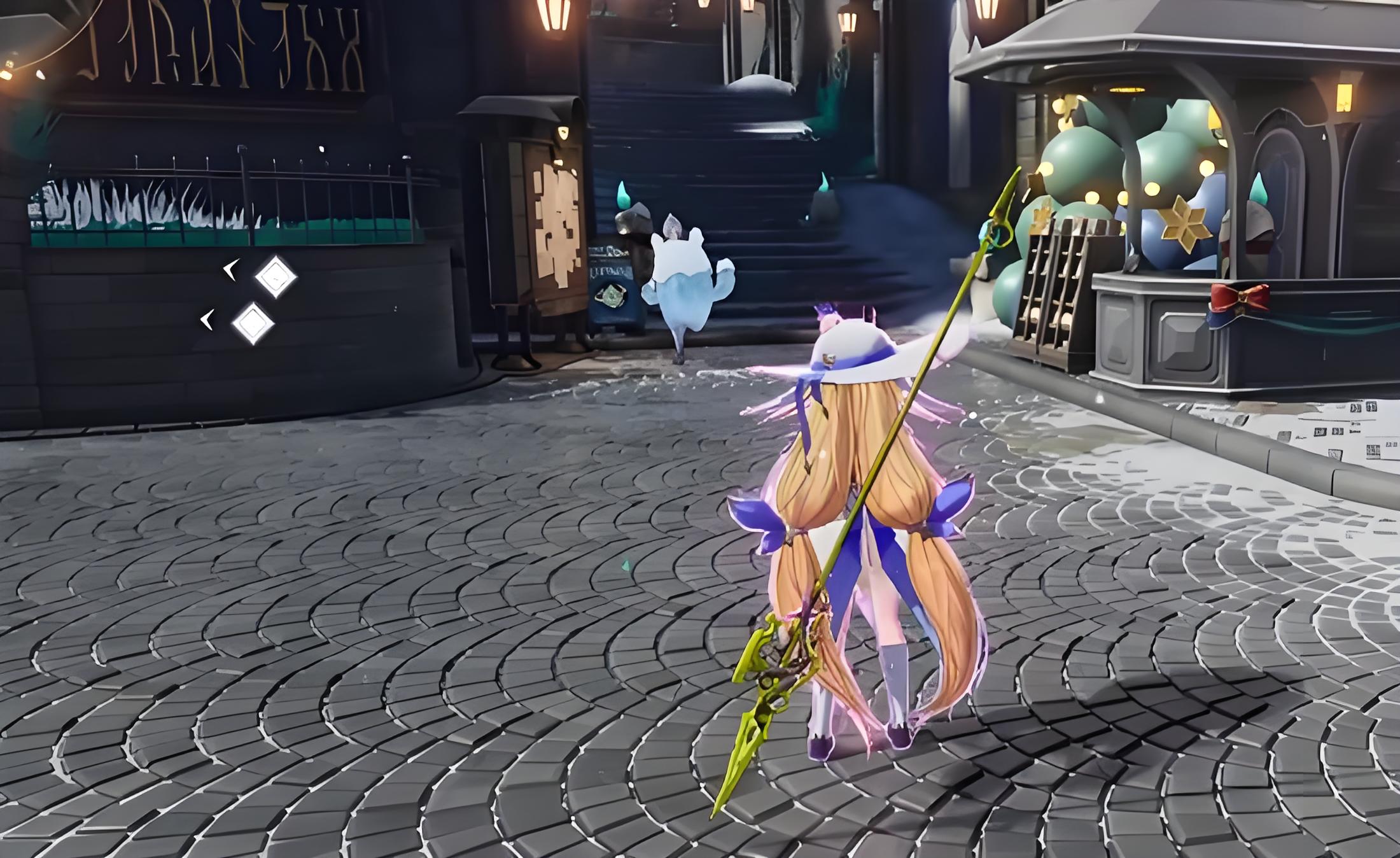 3、进入实地搜查阶段,沿画面微弱光芒指引前行,先与巴克先生邻居对话获取信息,再按引导攀爬至高处,沿楼梯抵达热闹集市区域。