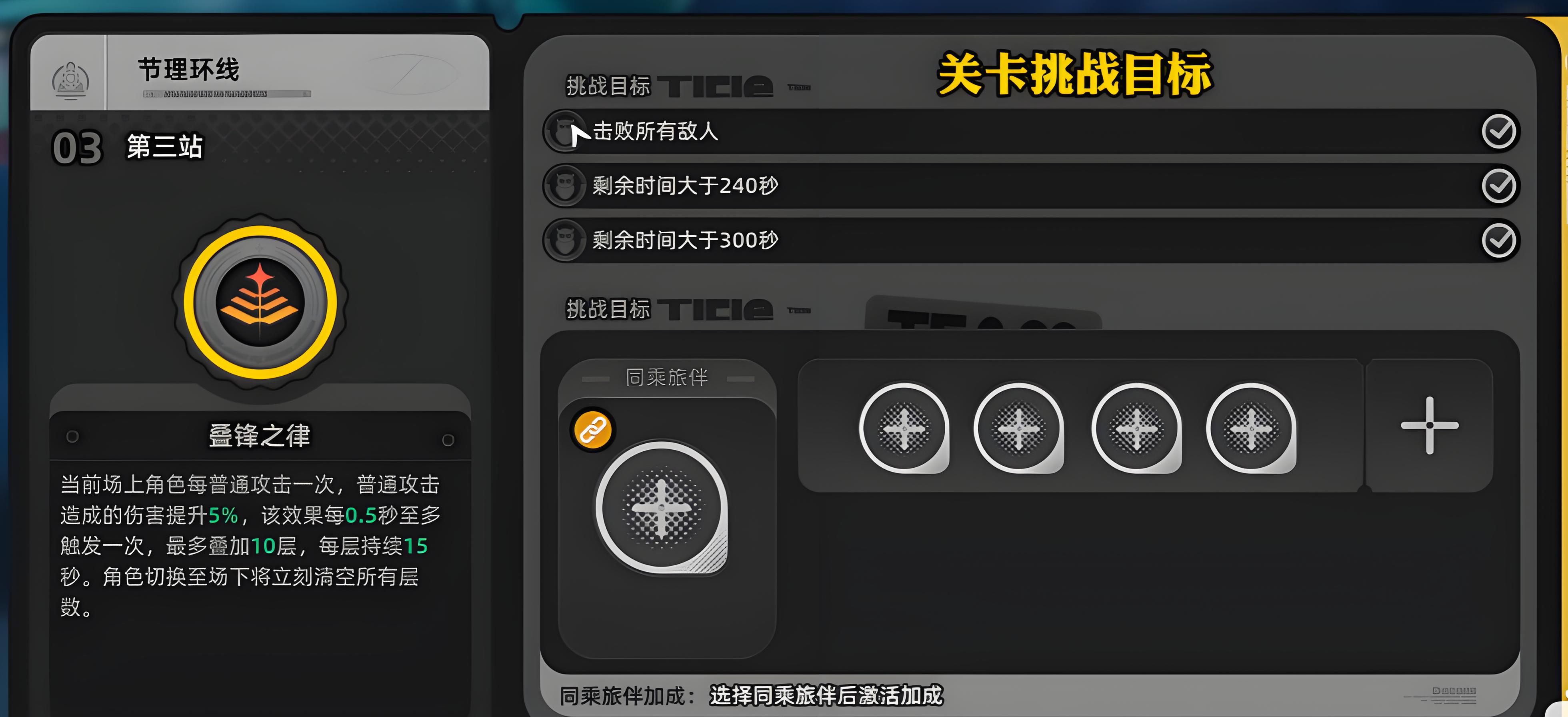 3、同乘旅伴功能可选一名加入队伍提供额外增益,其余四位置配置主战队伍,按关卡需求和个人战斗风格灵活调整阵容。