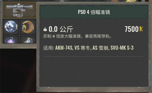 PS04倍瞄准镜获得需要去废料场里面的一堆铁架子中间找,这个镜子是苏制的4倍放大瞄准镜,适用于AKM-74S、VS寒冬、AS雪崩、SVU-MK S-3。