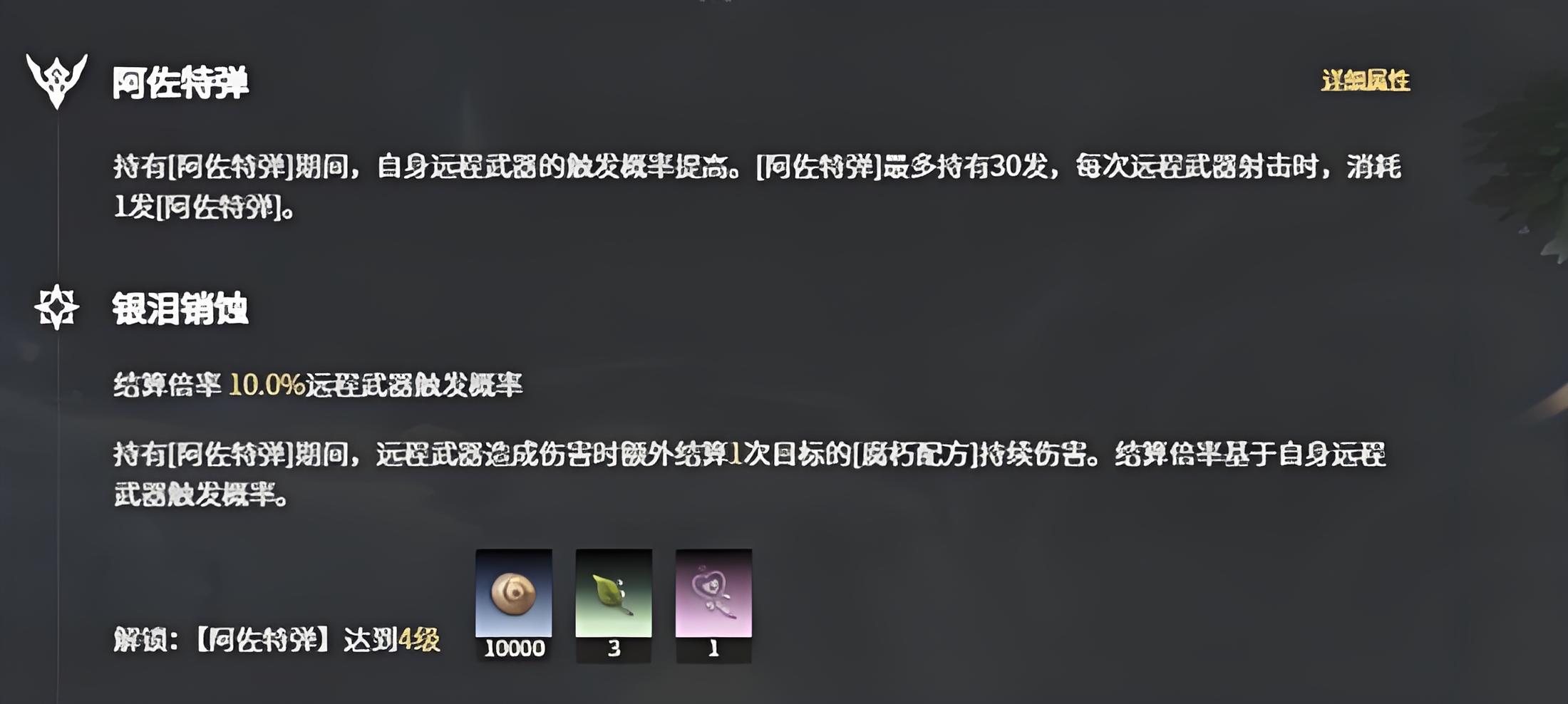 3、阿佐特弹是核心消耗机制,持有期间远程武器触发概率提升,射击消耗子弹且额外结算持续伤害增强全队输出。