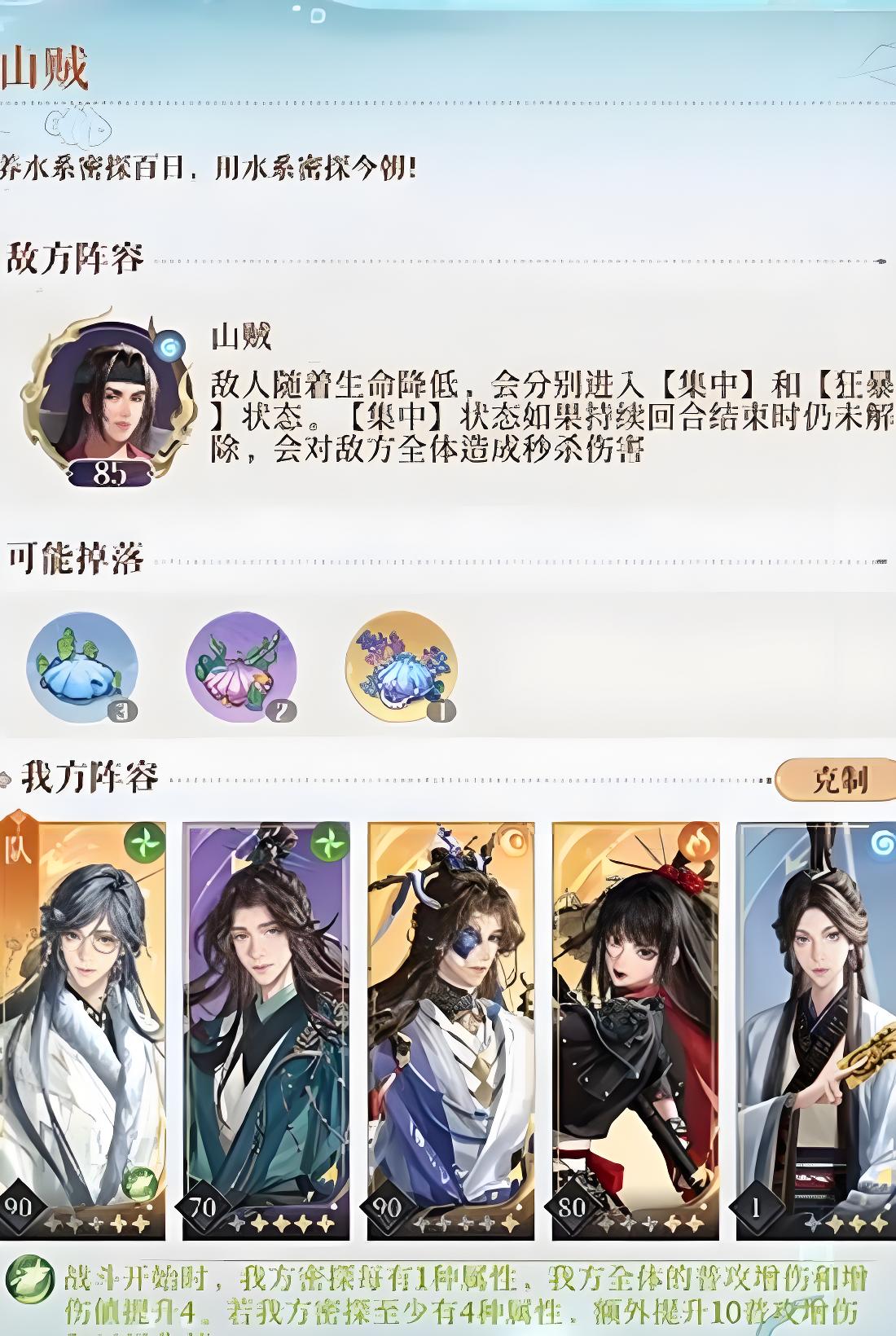 1、关卡核心机制是山贼生命值降至阈值会触发狂暴和集中状态,集中状态下若回合结束前未将其击败,会触发秒杀技能消灭所有己方角色。