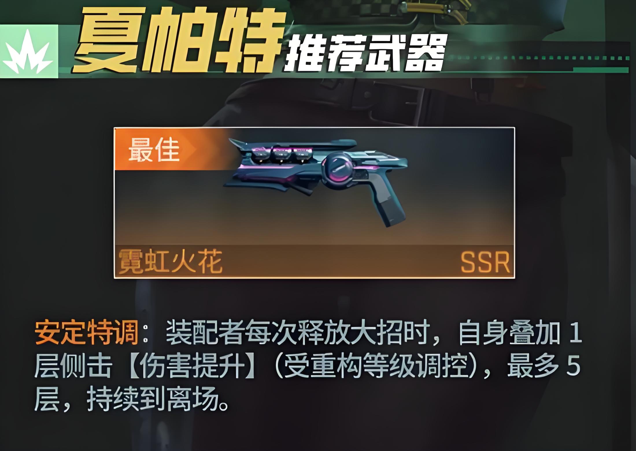 1、核心武器首选霓虹火花,释放大招后侧击附加增伤最多叠加5层,增益持续到角色离场,大招流还是侧击流都能提输出。