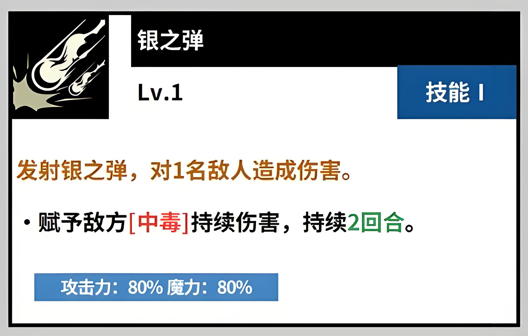1、一技能银之弹是主要起手技能,对单体敌人造成远程伤害,有概率附加中毒状态持续两回合,每回合造伤且降攻,冷却短易衔接。