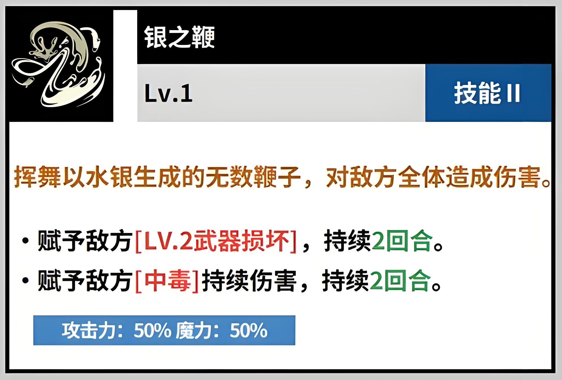 2、二技能银之鞭为范围攻击,对多个敌人造成群体伤害,命中后施加武器损坏效果,降敌方后续伤害持续两回合适配复数敌人场景。