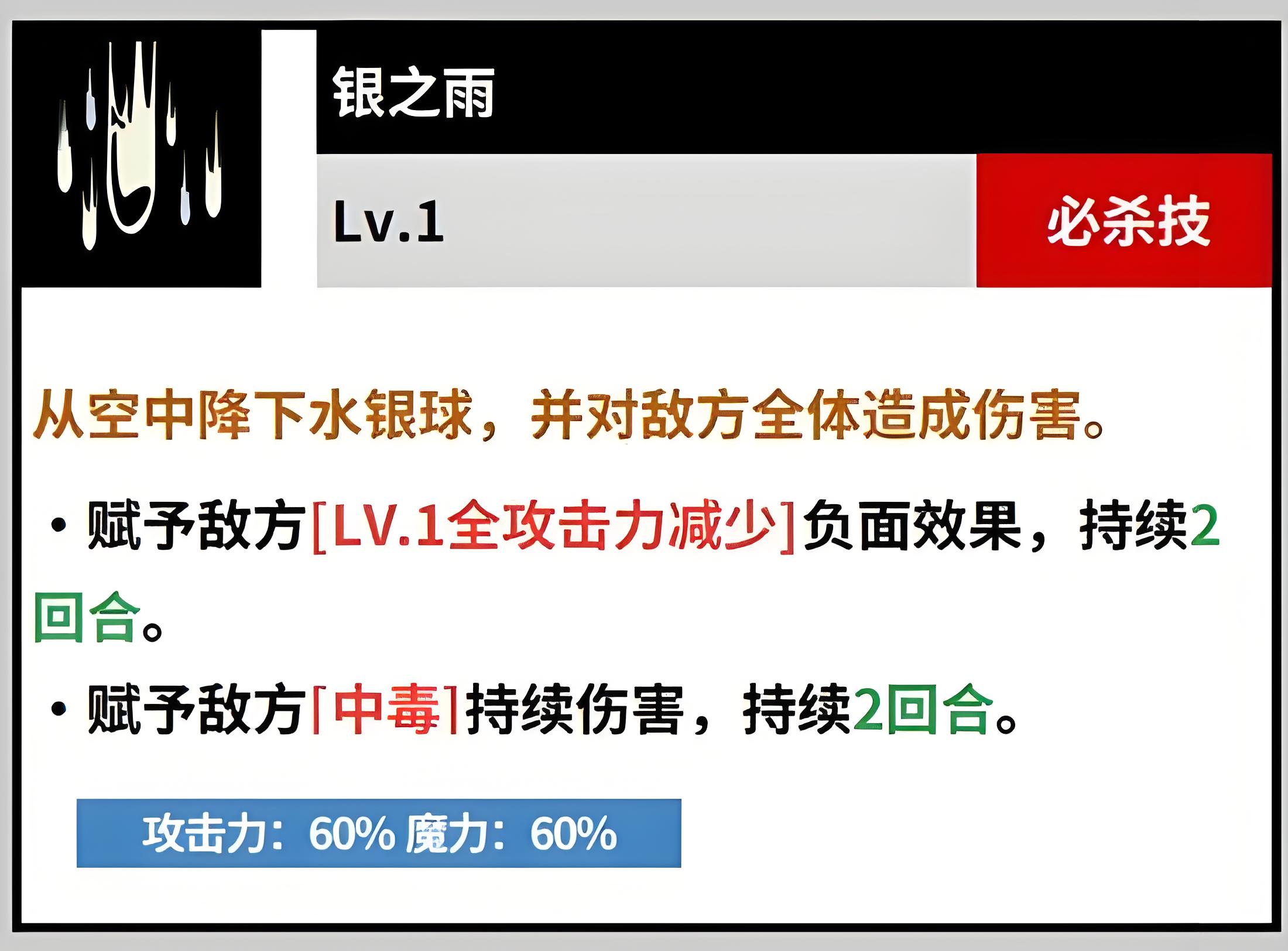 3、终极技能银之雨具备全屏覆盖能力,降下水银球对所有敌人造伤,降全体攻并附加中毒,高难副本或竞技场中可扭转战局。