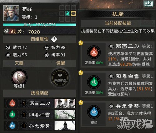 荀彧主动技能携带两面三刀可以让敌方受到伤害提升,追击技能携带阳春白雪给队伍血量最低的单位提供回复效果,被动技能携带兵无常势前三回合获得高额减伤。