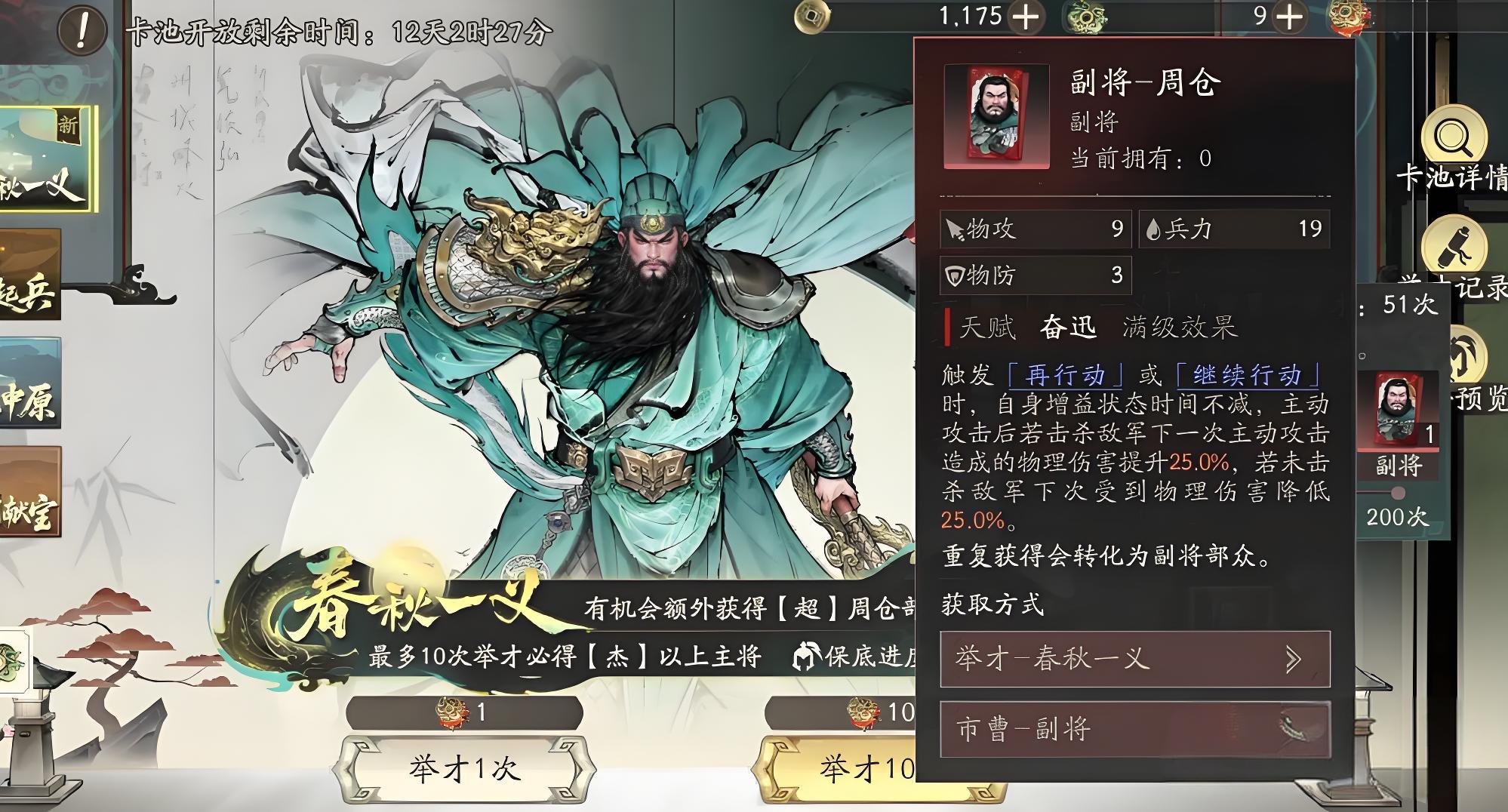 3、战斗机制形成循环,周仓主动攻击后主将击杀目标则下击增伤25%,未击杀则主将减伤25%,效果持续叠加维持双重收益。