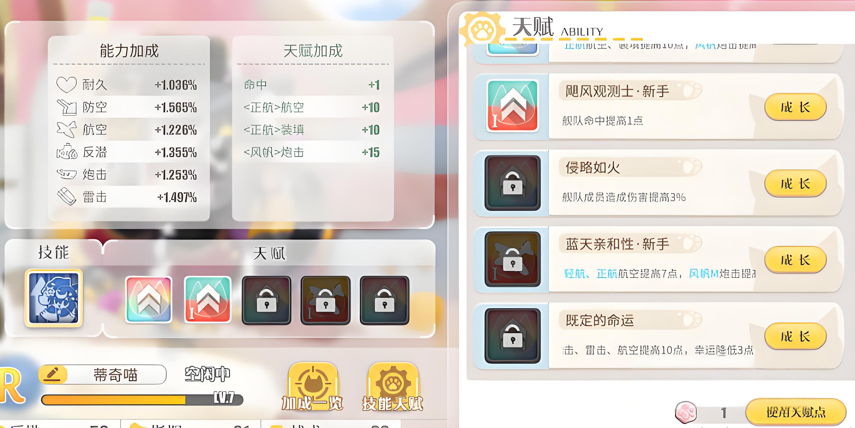 2、属性定位侧重加成,无明确司令猫参谋猫划分,战术与指挥属性突出,对航空与炮击属性加成较多适配对应编队需求。
