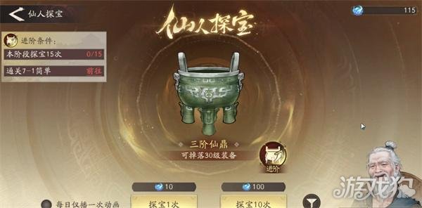 仙人探宝的核心机制围绕“仙鼎”展开,不同等级的仙鼎对应掉落不同品质的装备。仙鼎的等级则受“仙缘”影响,而仙缘主要通过挑战群英会获得。