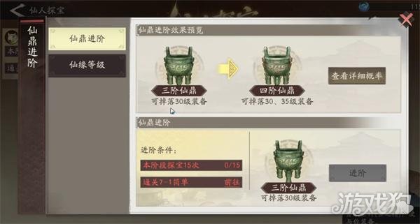 积累足够的仙缘值后,即可用于仙鼎的升阶操作。升阶条件会在探宝界面明确显示,但需注意每次升阶存在失败风险,系统会提前展示当前的成功概率。建议玩家在执行升阶前仔细查看成功率,合理规划资源使用,避免不必要的材料浪费。