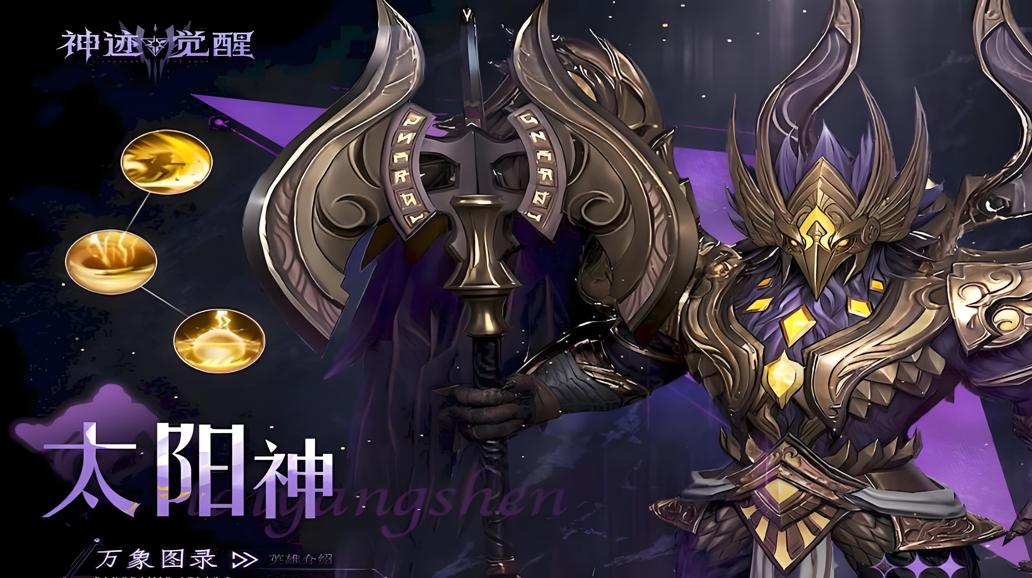 神迹觉醒中太阳神是自圣火中诞生、执掌昼夜轮转的核心神祇,其形象兼具神圣感与威慑力。鎏金与暗紫交织的战甲燃着永恒白昼,巨斧上的上古铭文流转着永恒神谕,鹰首冠冕下的目光如穿透云层的日光,静立间便让星辰循轨,每一缕神光都镌刻着执掌光明与预言的秩序威严,接下来将深入介绍这位强力角色的特点与技能。