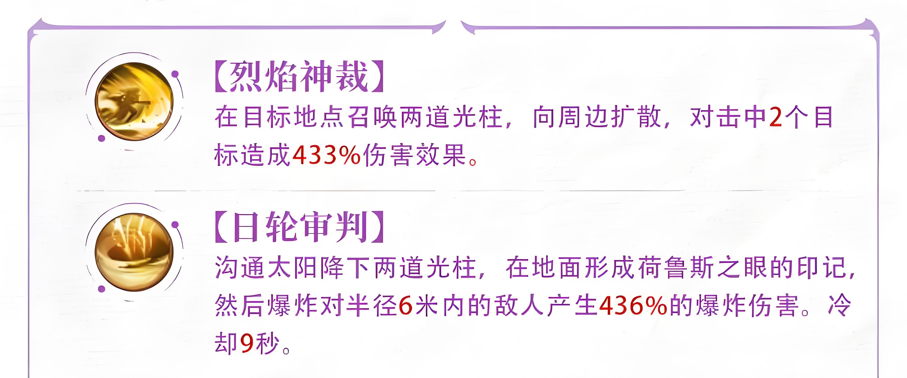 2、日轮审判沟通太阳降下两道光柱,地面形成荷鲁斯之眼印记后爆炸,对半径内敌人造百分比爆炸伤害且有冷却时间。