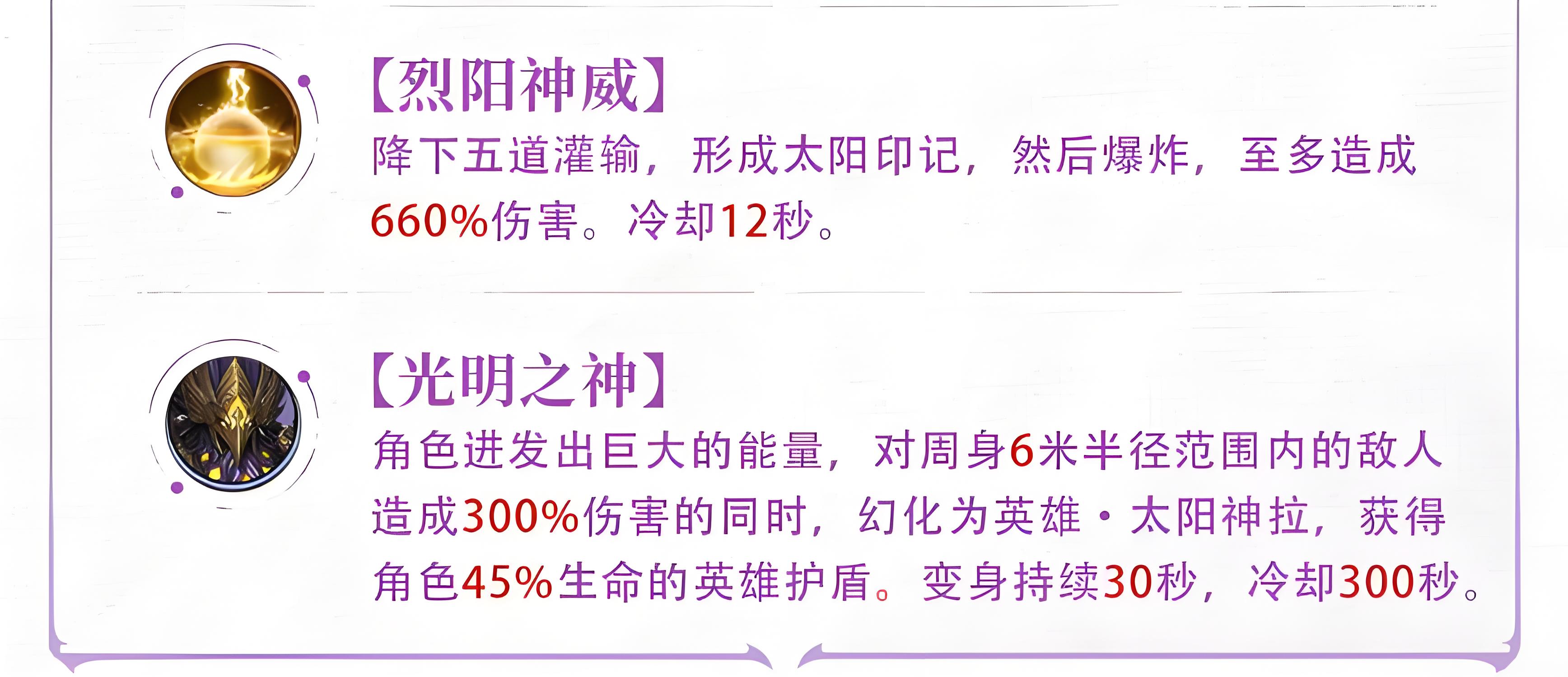 3、烈阳神威降下五道蕴含神力的光柱形成太阳印记,随后爆炸至多对范围内敌人造成百分比伤害且有冷却时间。