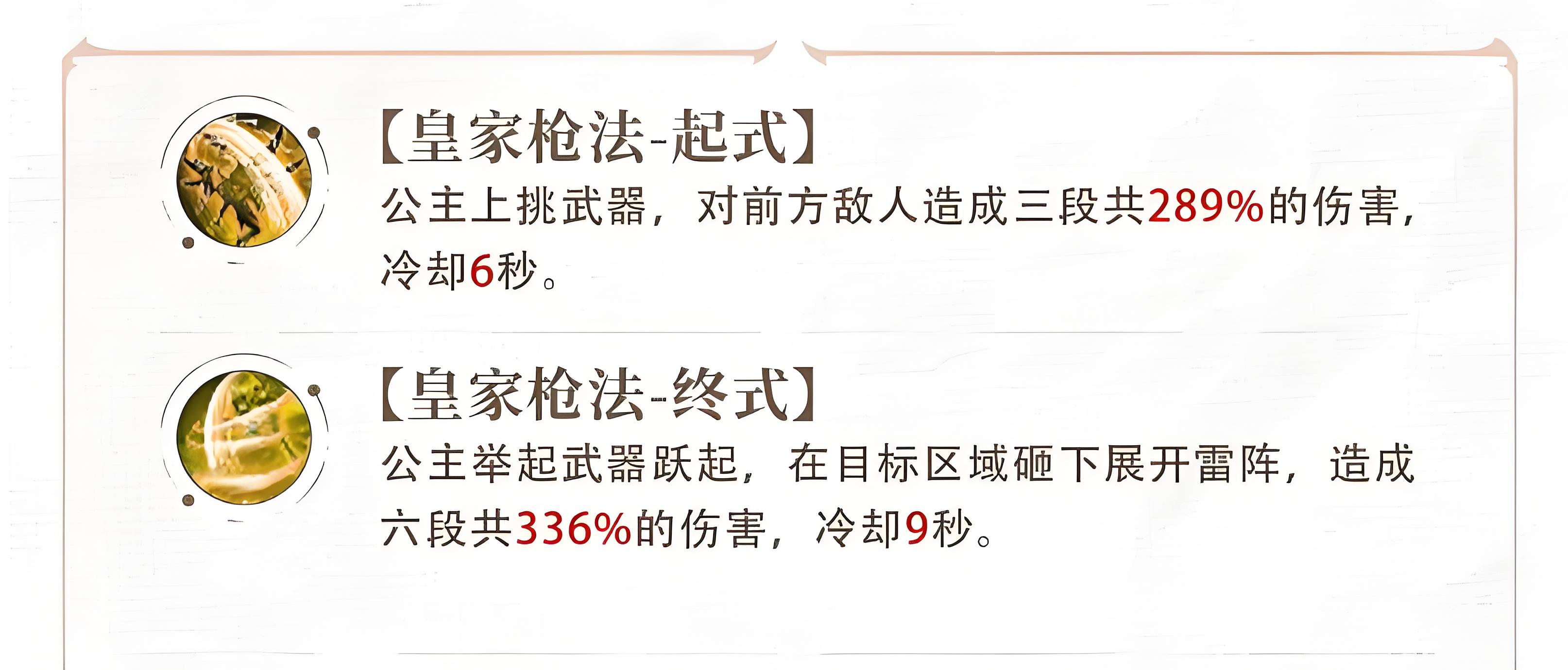 1、技能皇家枪法起式上挑武器,对前方敌人造成三段共289%伤害,冷却6秒,可快速发起基础输出打击敌人。