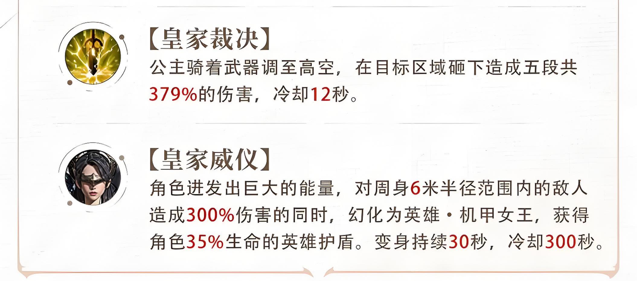 4、技能皇家威仪迸发能量伤6米内敌人,造300%伤害并化身机甲女王,获35%生命护盾,变身续30秒冷却300秒。