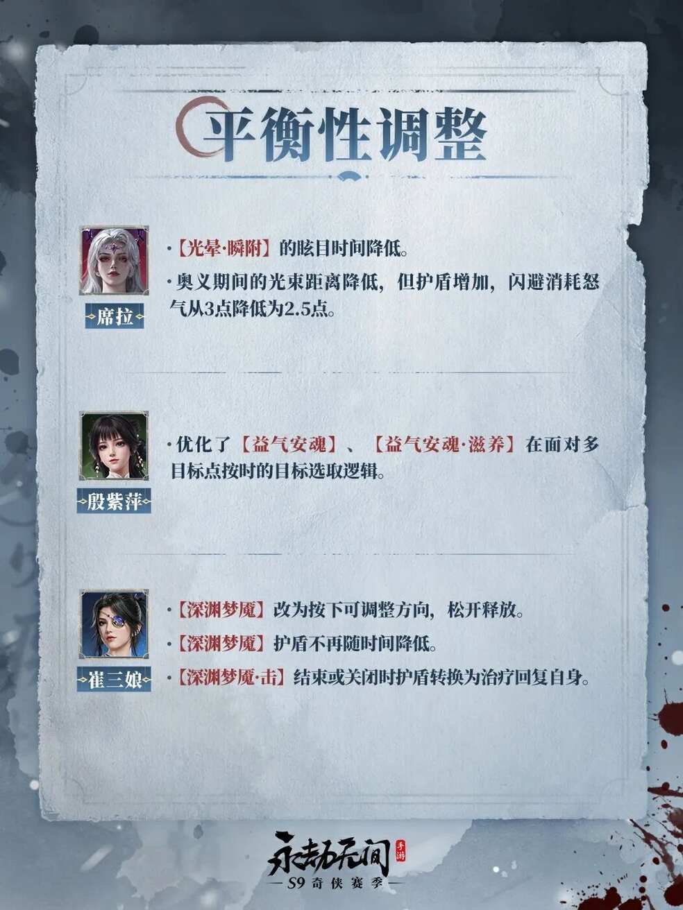 S9赛季英雄也迎来调整,根据后台数据与玩家反馈。我们将针对无尘、妖刀姬、魏轻、万钧、席拉、殷紫萍、崔三娘做出如下调整。