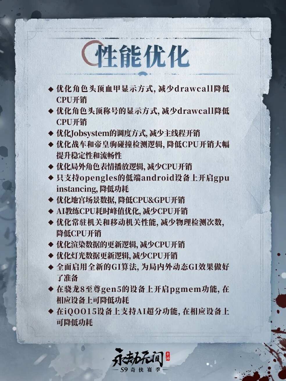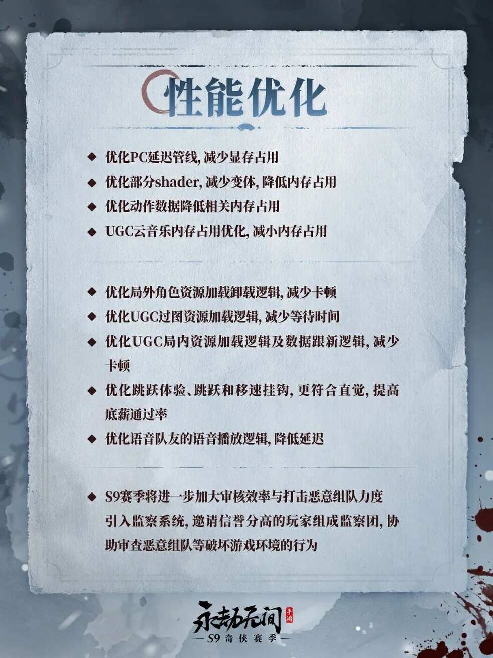 为了给大家带来更优质的游戏体验,我们持续对游戏性能、体验等方面进行优化!新赛季,有以下部分将迎来优化
