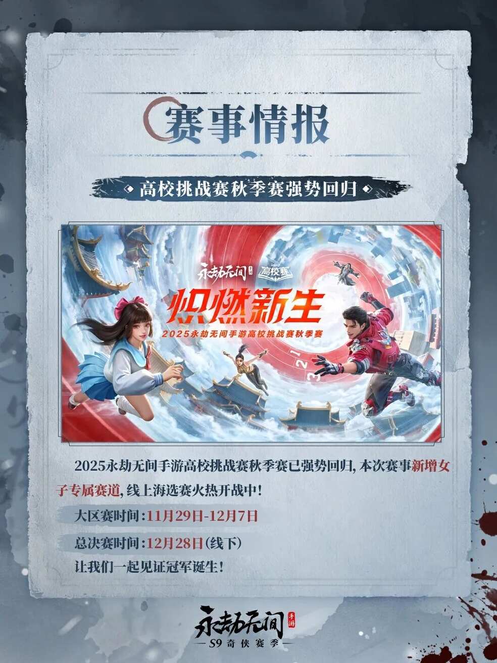 1、烛龙杯·金蛇年赛S2强势回归,总决赛将在11月15日和16日举办。