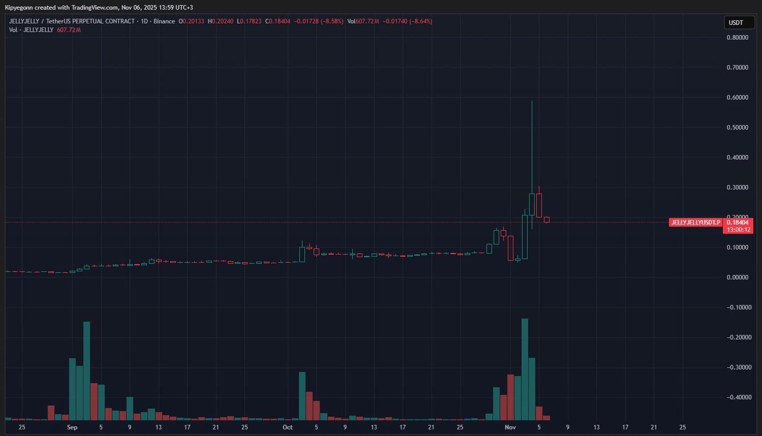 考虑到本周一些热门加密货币的表现,最好的策略是按兵不动。Jelly Jelly 和 Aster 加密货币的价格走势就是绝佳的例证。11 月 3 日,JELLYJELLY 价格飙升超过 200%,并在第二天继续上涨,涨幅高达 250%。然而,这波受 FOMO 情绪推动的上涨行情也随之结束。JELLYJELLY 回吐了 11 月 4 日的涨幅。截至发稿时,其价格下跌约 30%,且仍面临下行压力。