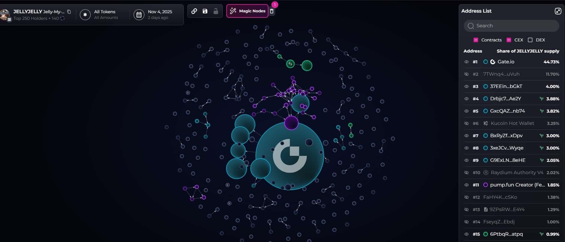 据分析平台 Bubblemaps 指出,自 2025 年 10 月下旬以来,有 7 个不活跃的钱包从 Gate.io 和 Bitget 提取了超过 20% 的模因币供应量。