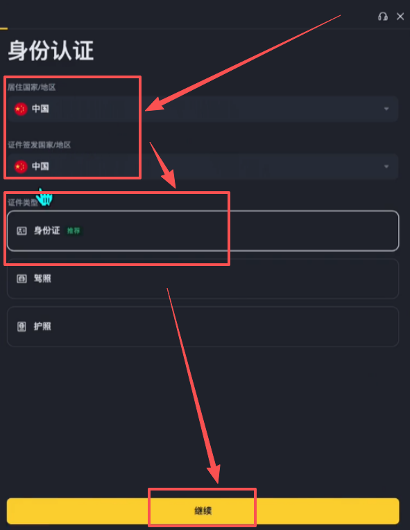 这个时候它就直接给我们跳转到了身份认证的页面,居住国家或地区这里,以及证件签发国家或地区这里我们直接都选择“中国”就可以了。接下来选择我们用来认证的证件类型,你可以选择身份证、驾照或者是护照,我这里比如说就选择“身份证”。点击【继续】。